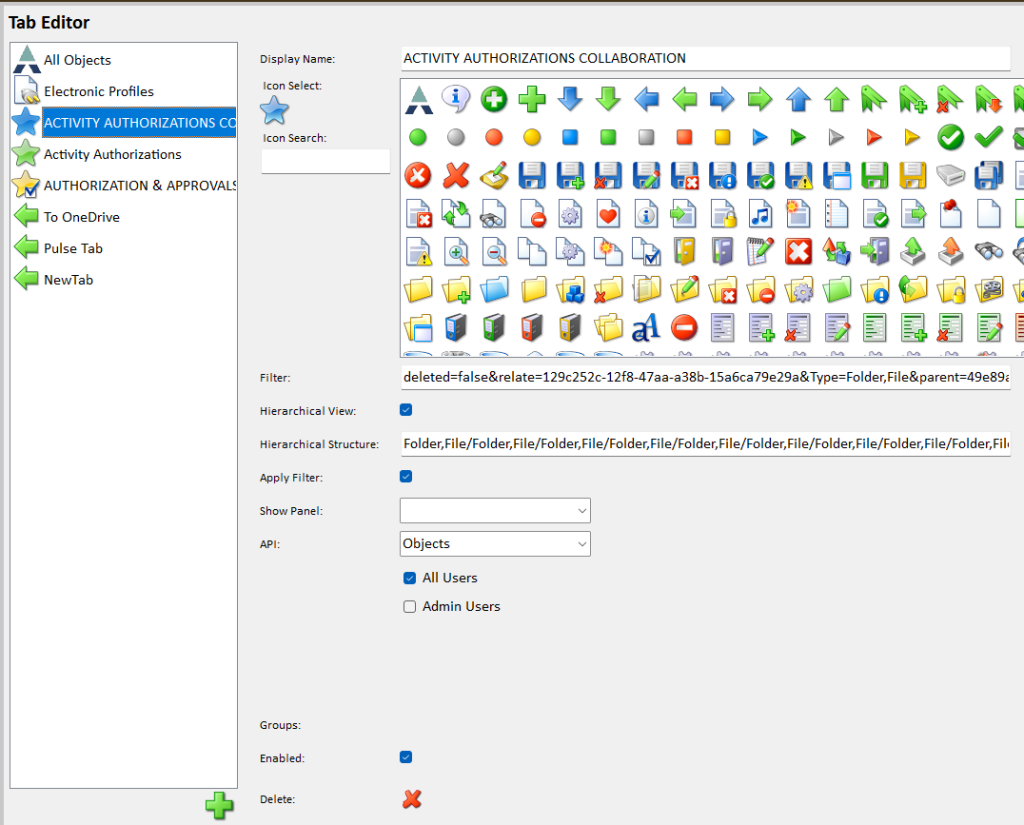 - Filter: Set this to link the tab to your selected electronic profile (your administrator can help you with the exact ID). Example: deleted=false&relate=49e89abc-75c6-4f95-8d30-4ae148c3e2b4