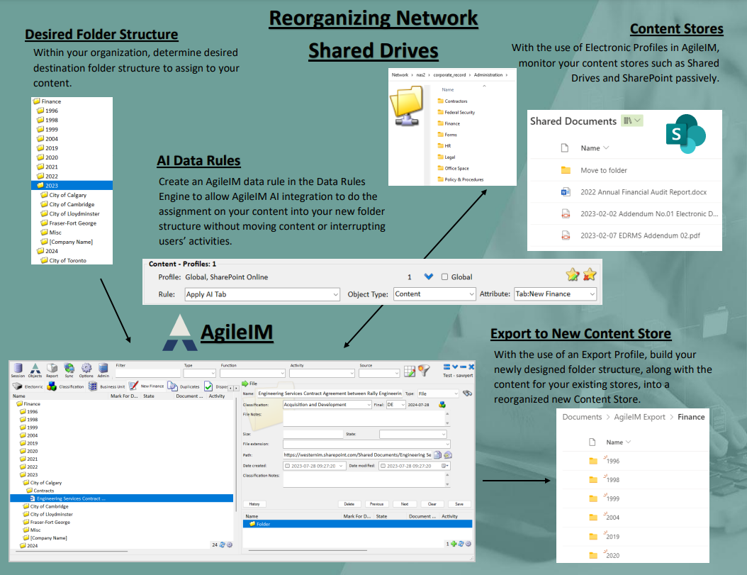 The process starts with creating the target folder structure for the desired end state. The folder structure can be created in AgileIM, or it can be imported from another source. An Electronic Profile is then created in AgileIM to point to the shared drive to be reorganized. AgileIM can reorganize part of a network drive, the whole network drive or even multiple different network shares into a single folder structure. This provides an easy way to aggregate multiple content stores into a single directory structure.